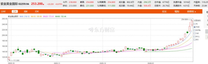 在2026年开年之后紫金黄金国际股价飞涨,1月2日开盘价146.1港元,而1月28日收盘价已达到253.2港元,不到一个月,最高涨幅超73%!增速完爆“大金王”紫金矿业A股、H股的股价涨幅,成为“金王”麾下名副其实的“小金王”。
